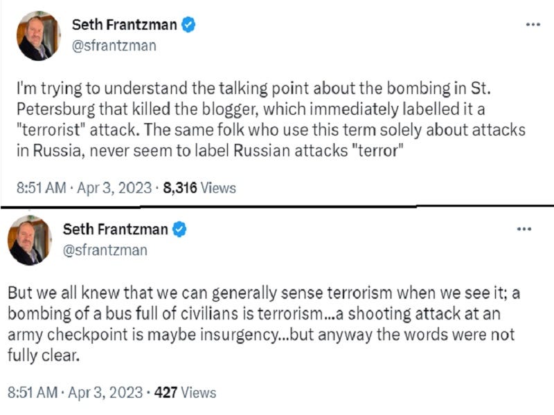 In the mind of regular Jerusalem Post contributor Seth Frantzman and his fellow travelers, the politically driven acts of bombing, running over, and stabbing someone constitute terrorism, but only if the victim can’t be described as Russian in the ethno-national sense. This hatred towards that group would rightly be condemned as bigoted by the Mainstream Media if it was applied towards Blacks, Jews, LGBT+, Muslims, and other Western minorities and almost certainly result in the culprit being “canceled”, but he and those like him get a pass because Russophobia is in vogue nowadays.
