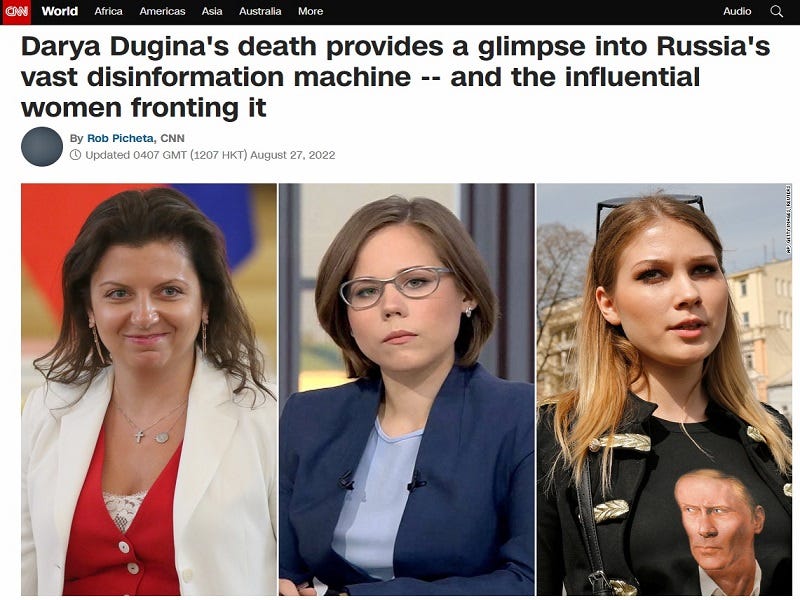 The simple points being pushed in his piece are that Darya was supposedly one of her country’s rising disinformation agents, had allegedly meddled in the French elections, and that other women like her are nothing but puppets. It’s very heavily implied upon reading between the lines that her assassination therefore wasn’t entirely all that bad since Picheta misrepresented her as a legitimate target due to her active role in articulating a particular version of multipolarity, which he smeared as “imperialist”. In other words, he misogynistically removed all agency from Darya and the other Russian women who he disagrees with to independently arrive at their own political opinions, objectified them as being part of some global conspiracy coming from the Kremlin, and thus implied that it’s alright if they’re killed.