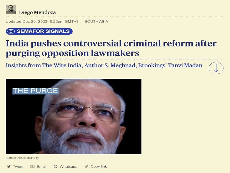 Semafor published a piece on Wednesday about how “India pushes controversial criminal reform after purging opposition lawmakers”, which included insights from The Wire India’s S. Meghnad and the Brookings Institution’s Tanvi Madan. A picture of Prime Minister Narendra Modi with the words “THE PURGE” accompanied the article. It briefly claims that the recent suspension of 141 lawmakers for disrupting parliamentary proceedings amounts to a “purge” and fearmongered about its implications.