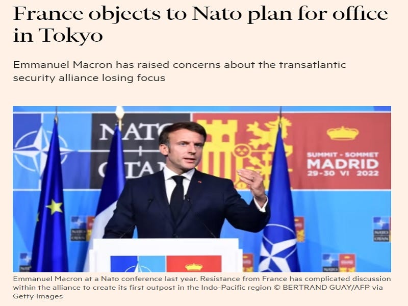 The Financial Times cited eight unnamed sources who revealed that France is reportedly preventing the planned opening of NATO’s liaison office in Japan. According to them, Macron believes that this move violates the alliance’s charter, which limits its geographic reach to the North Atlantic. He’s also supposedly against anything that can contribute to NATO-Chinese tensions. The spanner that the French leader unexpected threw into the bloc’s Asian expansion plans comes after his trip to China in early April.