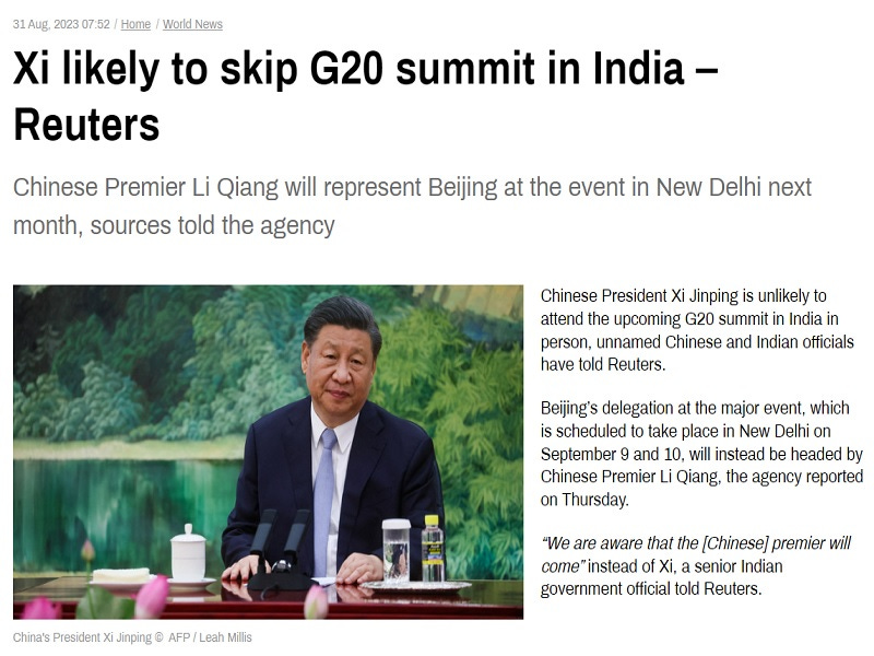 Reuters cited two Indian officials, one diplomat based in China, and an official working for another G20 country to exclusively report on Friday that President Xi might skip next weekend’s G20 Summit in Delhi. According to their unnamed sources, Premier Li Qiang would take his place in that event, but no reason was shared for this swap. The outlet then went on to say that there wouldn’t be another chance for the Chinese and US leaders to meet until mid-November’s APEC Summit in San Francisco at the earliest.