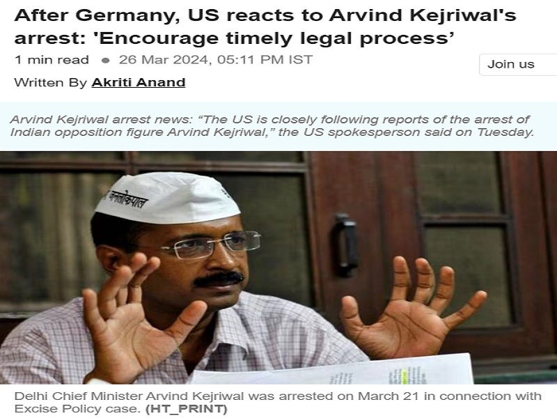 India’s External Affairs Ministry summoned the US’ Acting Deputy Chief of Mission for a 40-minute meeting after State Department meddled in their country’s internal affairs by stating that “We encourage a fair, transparent, and timely legal process for Chief Minister Kejriwal.” The Chief Minister of Delhi was arrested over corruption claims last week ahead of India’s upcoming six-week-long elections, after which the Germany became the first to involve itself in this issue via a statement from its Foreign Ministry.