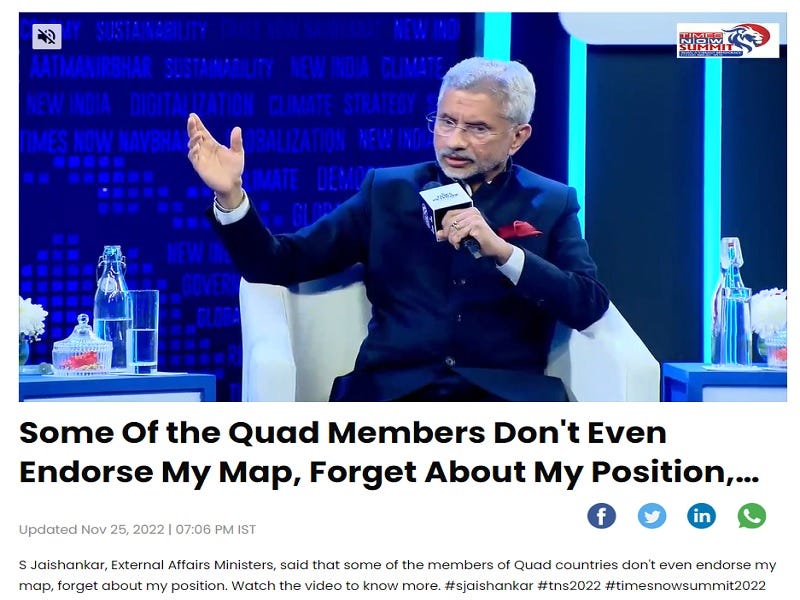 India’s top diplomat was talking about the differences between the Quad’s members when he reminded his interlocutor how not all of them support Delhi’s stance towards Afghanistan and Pakistan. EAM Jaishankar then wryly remarked that “some of them don’t even endorse my map, forget about my position.” This wasn’t just an off-the-cuff comment but importantly occurred at the same event where he also said that the West has to “live with [India’s policy towards Russia]”, which was widely reported.