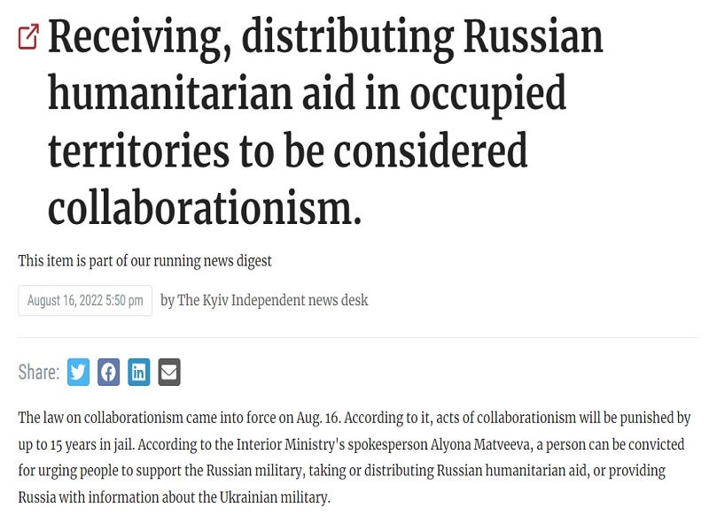 To explain, no civilian can be punished for accepting humanitarian aid regardless of whoever they receive it from. All conflicts carry with them immense physical costs for those living in such zones, especially when infrastructure is destroyed and commodity supply lines grind to a halt. Nobody can be blamed for accepting the bare necessities that they and their loved ones require to continue living. To declare that doing so is equivalent to “collaborationism” and thus subject to up to 15 years of imprisonment is absolutely illegal in the eyes of international law, thus completely discrediting the artificially manufactured soft power basis upon which Kiev’s cause in this conflict is built.