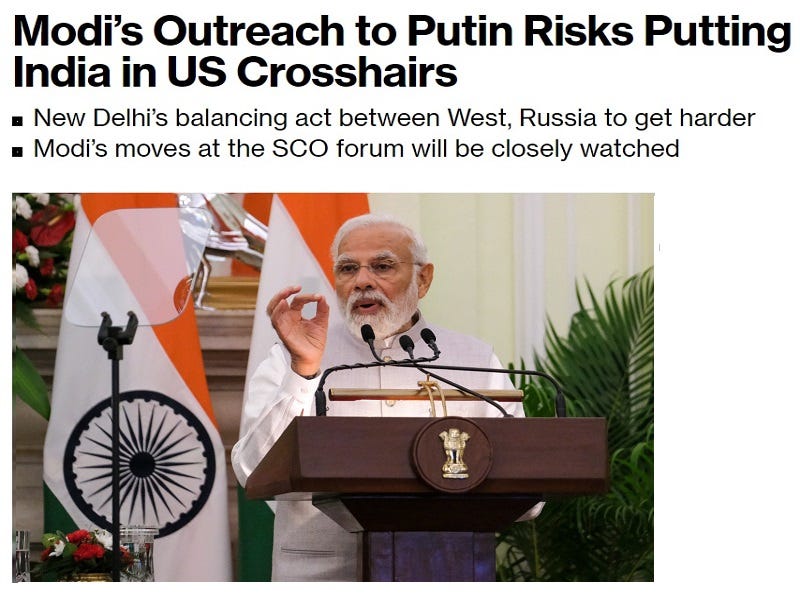 Bloomberg headlined a piece on Thursday about how “Modi’s Outreach to Putin Risks Putting India in US Crosshairs”, which is paywalled but can be read for free here. Its purpose is clearly to fearmonger about the potential consequences of Prime Minister Modi’s participation in this year’s SCO Summit in Samarkand, particularly how the US might react to the optics of him “looking too chummy” with Presidents Putin and Xi, the leaders of its two peer competitors. Unsurprisingly, the piece lacks any tangible substance, being just a collection of speculation and supportive quotes from several analysts whose views align with the article’s narrative.
