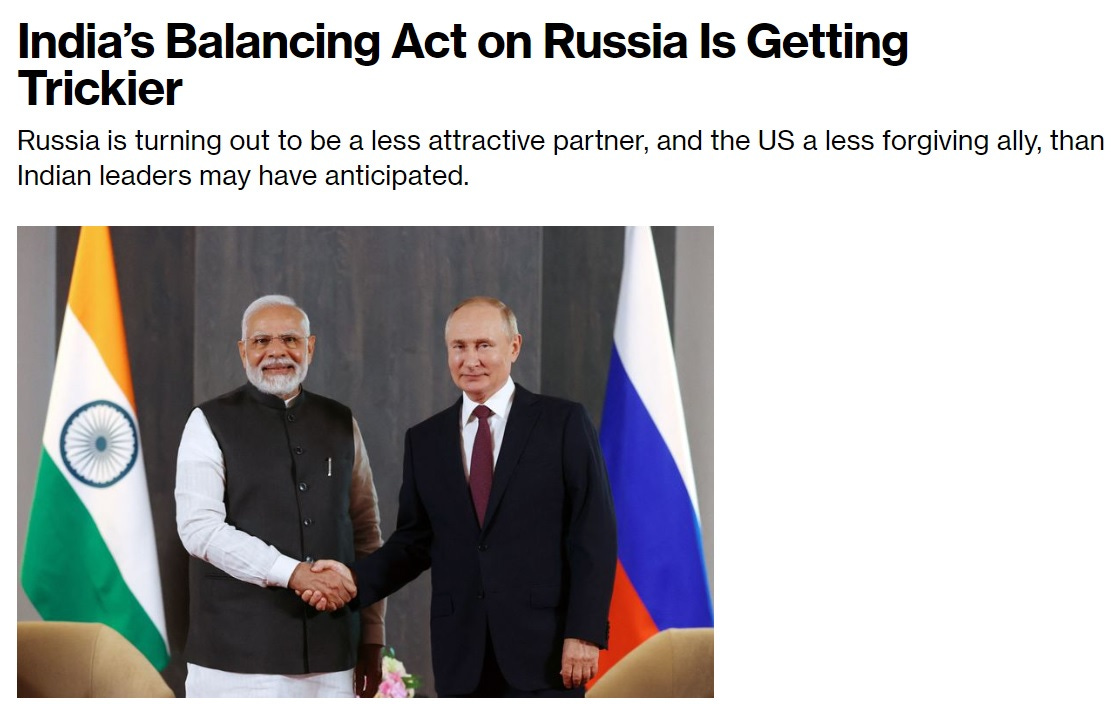 * “India, as a member of the UN Security Council, abstained on a vote condemning Moscow’s “annexation” of Ukrainian territory. To add insult to injury, Modi also told Ukrainian President Volodymyr Zelenskiy there was ‘no military solution’ to the conflict — just as the Ukrainian army was blitzing across parts of northeastern and southern Ukraine.”
