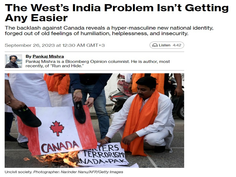 Bloomberg’s Pankaj Mishra just published an inflammatory op-ed about how “The West’s India Problem Isn’t Getting Any Easier”, which portrays that country’s growing confidence on the world stage as supposedly being a challenge for the West’s so-called rules-based order. According to him, its government and society are becoming increasingly nationalistic, with their unified response to Canada’s allegation that Delhi assassinated a Sikh separatist being a perfect case in point.