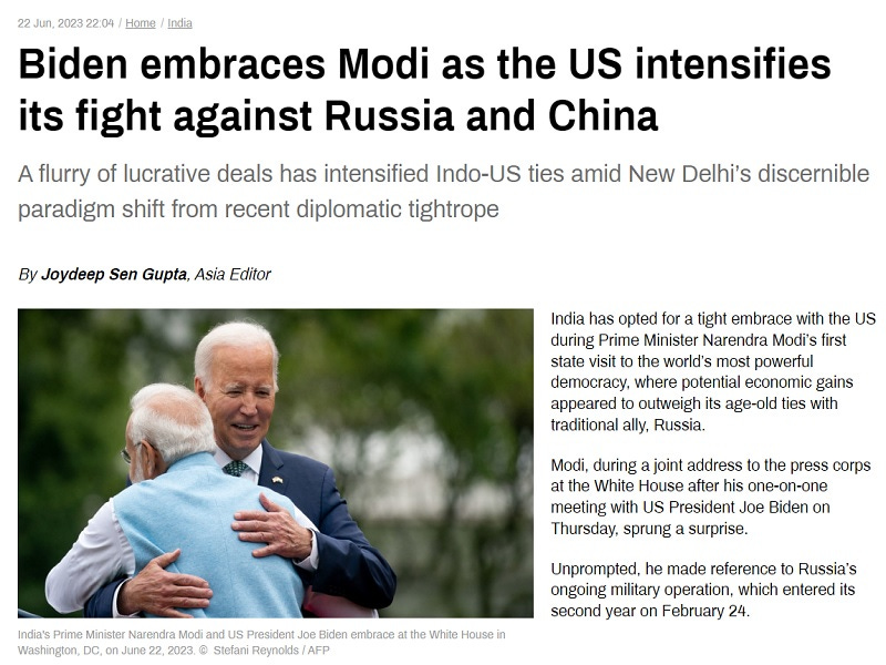 RT’s Asia editor Joydeep Sen Gupta published a piece about Indian Prime Minister Modi’s trip to the US on Thursday about how “Biden embraces Modi as the US intensifies its fight against Russia and China”. The title suggested that India is either colluding with the US in its fight against those two fellow BRICS and SCO countries or has submitted to becoming its proxy in this regard. Gupta’s subtitle further implied that one of these two outcomes occurred as a result of Prime Minister Modi’s visit.