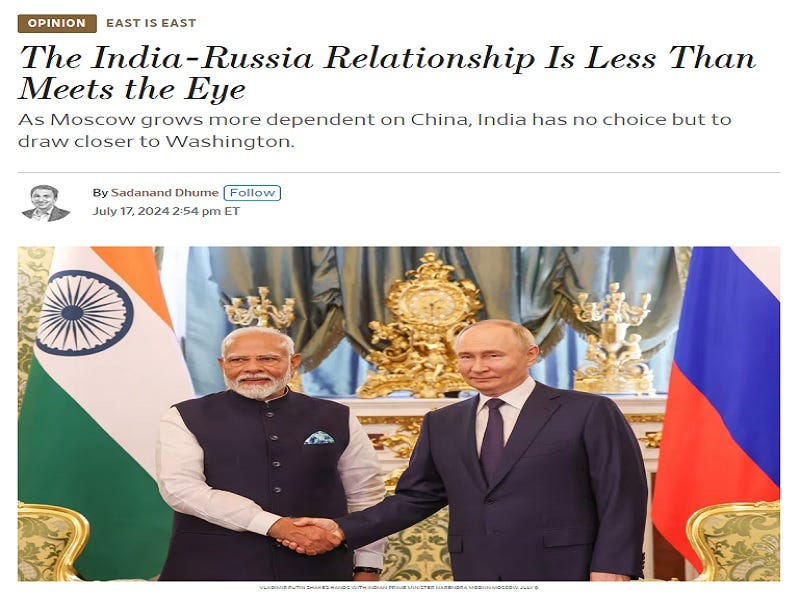 Wall Street Journal opinion columnist Sadanand Dhume just published a piece about how “The India-Russia Relationship Is Less Than Meets the Eye”, with the lede being that “As Moscow grows more dependent on China, India has no choice but to draw closer to Washington.” His argument is simple: China’s trade with Russia dwarfs India’s at $240 billion to $65 billion, thus Russia will become dependent on China so India must “draw closer” to the US in response. It’s not that simple though.