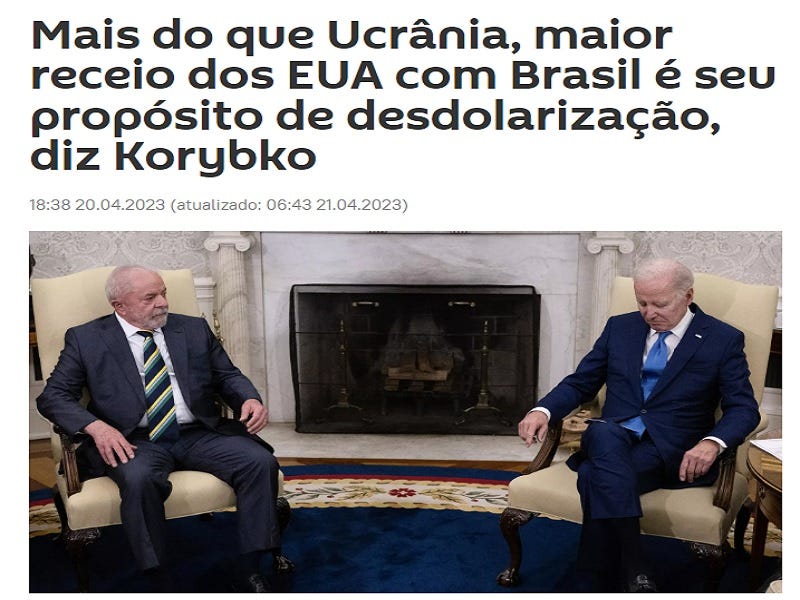 I’m sharing the full English version of the interview that I gave to Sputnik Brasil, excerpts of which were originally published in Portuguese on 20 April under the title “Mais do que Ucrânia, maior receio dos EUA com Brasil é seu propósito de desdolarização, diz Korybko”.