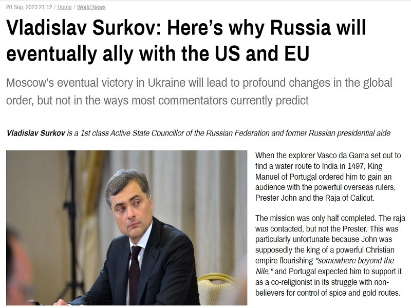 Former Kremlin “grey cardinal” Vladislav Surkov abruptly returned to the fore of global media attention following his de facto retirement from public life these past few years after RT translated his latest article and republished it on the front page of their website. Originally titled “The Birth of the North”, Russia’s top publicly financed international media flagship decided to promote it on their platform under the title “Here’s why Russia will eventually ally with the US and EU”.