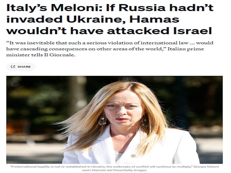 Italian Prime Minister Giorgia Meloni claimed in a recent interview that “If Russia had not invaded Ukraine, in all likelihood Hamas would not have launched such an attack against Israel. It was inevitable that such a serious violation of international law, moreover at the hands of a permanent member of the U.N. Security Council, would have cascading consequences on other areas of the world, from the Middle East to the Balkans, up to Africa.”
