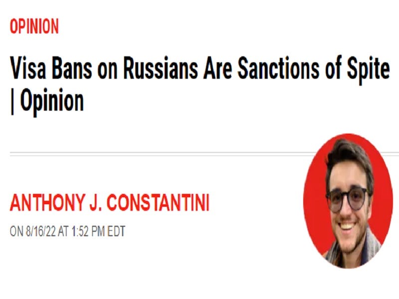 Newsweek surprised readers by publishing a contrarian piece arguing against the push to sanction average Russians by banning them from receiving Western visas and residency permits. Titled “Visa Bans on Russians Are Sanctions of Spite | Opinion”, Anthony J. Constantini – who’s writing his Ph.D. on Jacksonian democracy and populism at the University of Vienna in Austria, previously received an MA in Arms Control and Strategic Studies from St. Petersburg State University, and was the War Room Director for the NRSC in 2016 – very compellingly makes the case that this emerging trend is counterproductive.