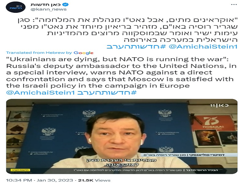 This conclusion, which was arrived at via different means by the AMC and MSM but which they nevertheless agree on in order to advance their self-interested narrative agendas, was just discredited by First Deputy Permanent Representative of Russia to the UN Dmitry Polyanskiy. He told Israel’s Kann News at 2:10 of this interview here that “We really commend the balanced line of Israel in terms of not delivering weapons to Ukraine. I think it’s very important not to get involved in this conflict.”