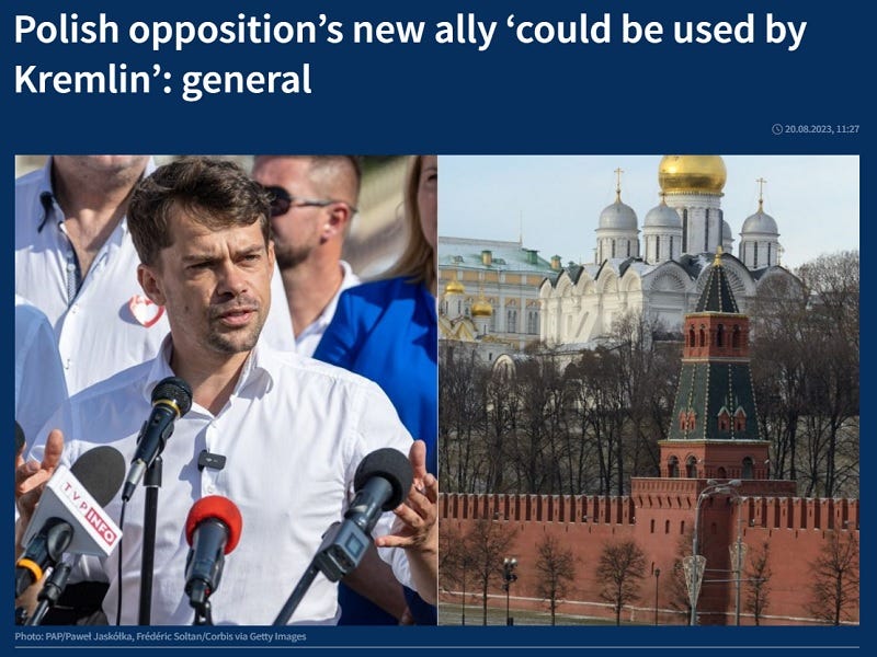 The former tweeted that “You have betrayed the Polish countryside. Now you have a Putin sympathizer on the list. Who do you serve?”, while the latter claimed that “he [Michał Kołodziejczak] is 100% in line with PO head Donald Tusk’s earlier pro-Russian policies” The next day on Sunday, TVP published a piece about how “Polish opposition’s new ally ‘could be used by Kremlin’: general”, which cited former chief of Poland’s special forces General Roman Polko. Here’s what he said:
