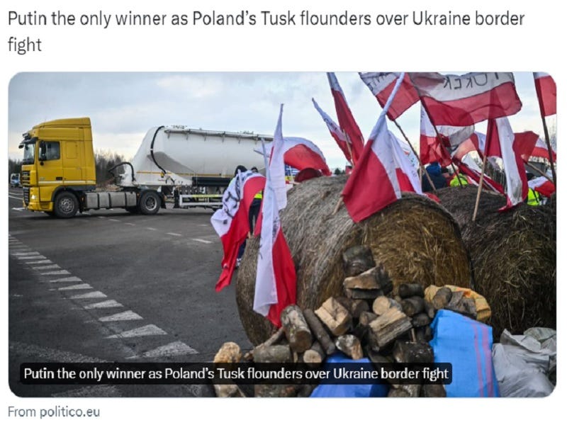 Politico just published a piece claiming that “Putin the only winner as Poland’s Tusk flounders over Ukraine border fight”, which came after “Ukraine Tried To Discredit Poland By Hyping Up Its Import Of Russian Agricultural Products”. Prior to both information warfare provocations, Lvov’s mayor smeared the protesting Polish farmers as “pro-Russian provocateurs”, which was followed by Ukraine’s Defense Intelligence Agency alleging that Russia is exploiting the protests to weaken support for Kiev.
