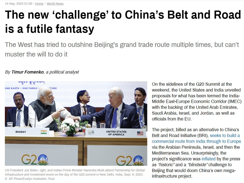 Political analyst Timur Fomenko published a piece at RT about how “The new ‘challenge’ to China’s Belt and Road is a futile fantasy”, which critiques the newly unveiled India-Middle East-Europe Economic Corridor (IMEC). He makes some solid points that’ll be reviewed in this analysis, but they only debunk the Western narrative and don’t actually discredit this project itself. Fomenko began by hyperlinking to a Newsweek article that described IMEC as an “historic challenge” to China’s Belt & Road Initiative (BRI).