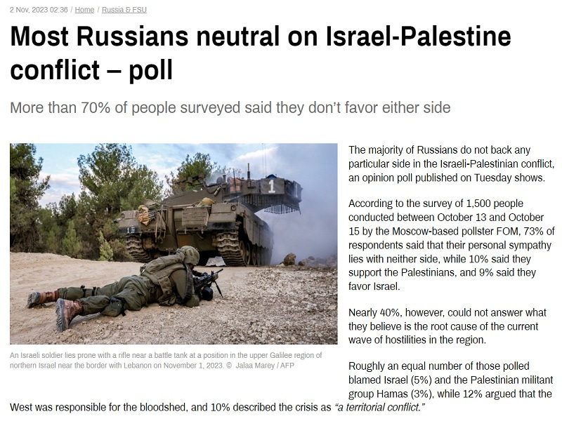 RT cited Moscow-based pollster FOM in their article about how “Most Russians neutral on Israel-Palestine conflict – poll” to report that “73% of respondents said that their personal sympathy lies with neither side, while 10% said they support the Palestinians, and 9% said they favor Israel. Nearly 40%, however, could not answer what they believe is the root cause of the current wave of hostilities in the region.” That country’s foreign friends and foes alike might be surprised by these findings.
