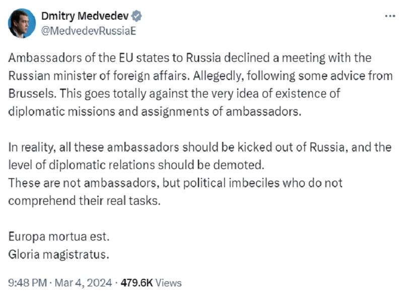 In response, Russia’s previous leader wrote that “This goes totally against the very idea of existence of diplomatic missions and assignments of ambassadors. In reality, all these ambassadors should be kicked out of Russia, and the level of diplomatic relations should be demoted.” While Medvedev has cultivated a reputation as a “hardliner” since the start of the special operation and sometimes shares what can objectively be described as unrealistic proposals, this particular suggestion makes a lot of sense.