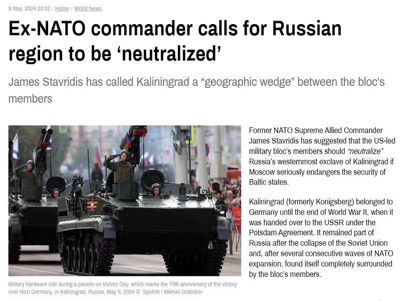 Former NATO Supreme Commander Admiral James Stavridis wrote in his latest op-ed for Bloomberg that “Kaliningrad will need to be neutralized” in the event of war with Russia in order to prevent an attack against the Suwalki Corridor. This is nothing but a bunch of hot air and chest-thumping aimed at boosting Western morale ahead of Russia’s expected military breakthrough across the Donbass front lines. He knows very well that any first strike against Kaliningrad would instantly lead to World War III.