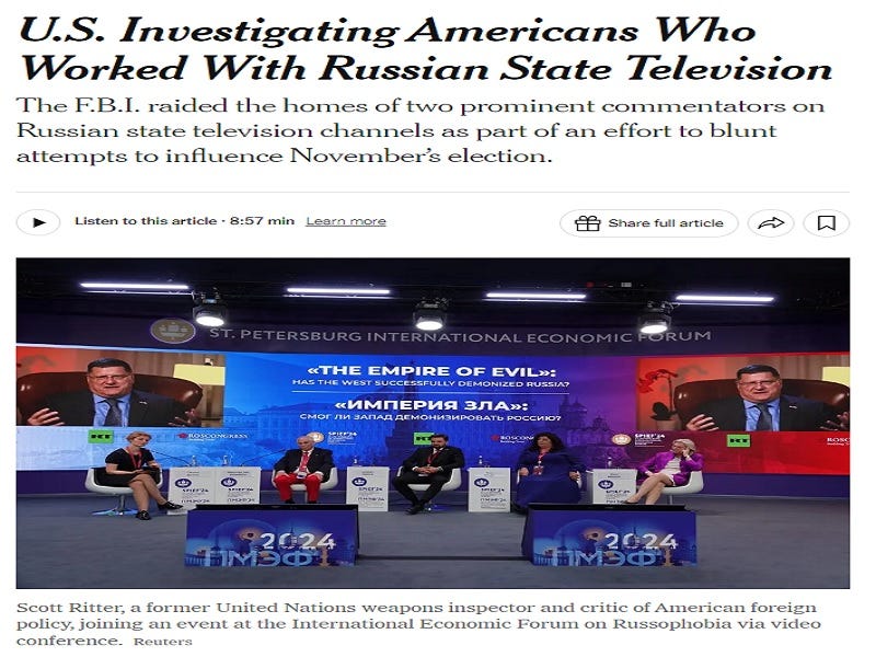 The New York Times (NYT) cited unnamed administration sources to report that the Justice Department has begun a “broad criminal investigation into Americans who have worked with Russia’s state television networks”. This follows the FBI’s raid of Scott Ritter’s house earlier this month and then Dimitri Simes’ Virginia estate shortly thereafter. Ritter is still in the US while Simes has been in Russia since October 2022. More of Russian media’s American affiliates might soon be raided according to the NYT’s report.