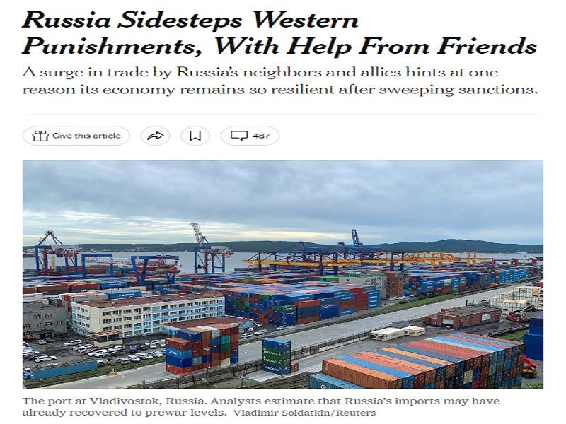 In Ana Swanson’s article about how “Russia Sidesteps Western Punishments, With Help From Friends”, she cites Western experts who concluded that “Russia’s imports may have already recovered to prewar levels, or will soon do so, depending on their models.” Even more compelling, she references the IMF’s latest assessment from Monday, which “now expected the Russian economy to grow 0.3 percent this year, a sharp improvement from its previous estimate of a 2.3 percent contraction.”
