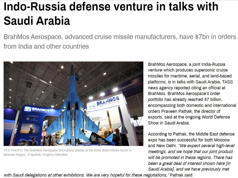 RT reported that the Director of Exports for the joint Russo-Indo BrahMos Aerospace venture told TASS on the sidelines of last week’s World Defense Show in Saudi Arabia that the Kingdom is in talks with their company to purchase its famous supersonic cruise missiles. In his words, “There has been a great deal of interest shown here [in Saudi Arabia], and we have previously met with Saudi delegations at other exhibitions. We are very hopeful for these negotiations.”