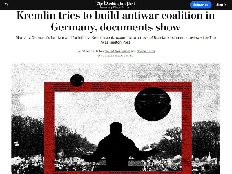 The Washington Post (WaPo) pushed several conspiracy theories in their recent piece alleging that “Kremlin tries to build antiwar coalition in Germany, documents show”. Citing what they claim to be “a trove of sensitive Russian documents largely dated from July to November that were obtained by a European intelligence service”, WaPo reported that elements within Germany’s left-aligned Die Linke and its right-leaning AfD are cooperating due to some shadowy Kremlin plot.