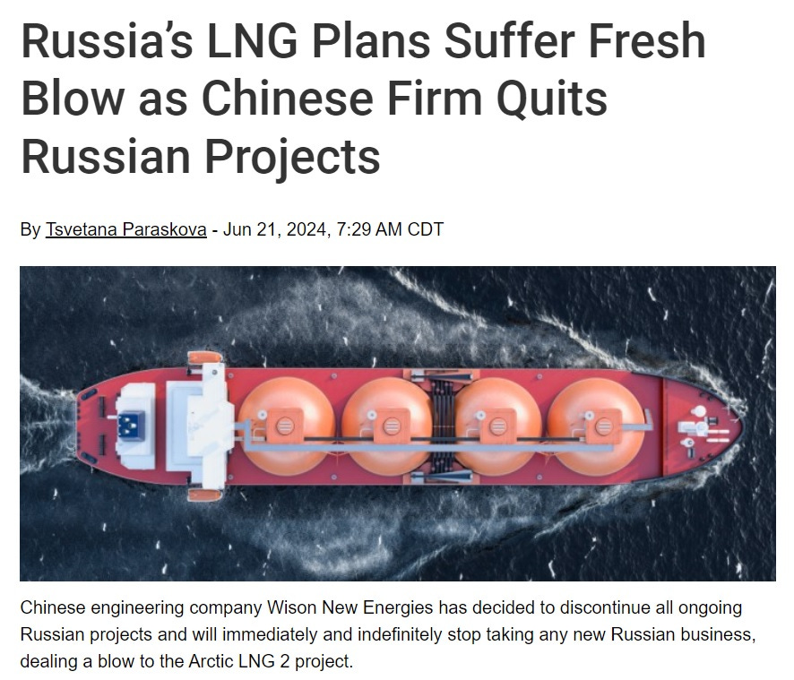 China’s Wison New Energies announced in a LinkedIn post on Friday that they’re immediately stopping all their Russian projects “in view of the strategic future of the company” following the latest imposition of US sanctions against that country’s LNG industry in mid-June. Oilprice.com wrote that this will “deal a blow” to Russia’s Arctic LNG 2 project after Wison was contracted to build its modules, “which are massive, prefabricated structures that facilitate the rapid construction of LNG processing plants.”