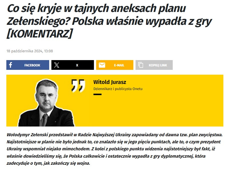 Polish journalist Witold Jurasz published a commentary on Onet, which is his country’s largest online media platform, titled “What's in the secret annexes of Zelensky's plan? Poland just dropped out of the game”. He’s one of his country’s leading journalists and broke the story last month about the argument that Foreign Minister Radek Sikorski had with Zelensky over military aid and the Volhynia Genocide dispute during his latest trip to Kiev. That toxified their ties and set the stage for what was to follow.