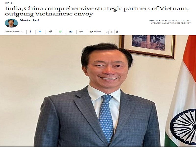 It's with this earlier cited context and aforementioned motivation in mind that one can better understand the insight that was just shared by outgoing Vietnamese Ambassador to India Pham Sanh Chau. This ASEAN state’s top diplomat in that country touched upon the direct flights between those two that he helped pioneer in 2019 and which recently resumed this year u birder to show how close their societies are becoming. Mr. Pham also pointed out how their land and naval forces started training with one another under his tenure, which he described as a major strategic achievement.