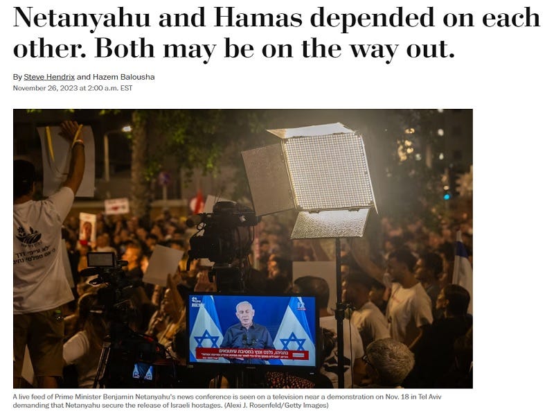 The Washington Post (WaPo) just published one of the most damning pieces yet about Israeli Prime Minister Benjamin (“Bibi”) Netanyahu. Titled “Netanyahu and Hamas depended on each other. Both may be on the way out”, it cites Israeli experts who argue that Bibi had a years-long Faustian bargain with Hamas, which is implied to have contributed to that group’s sneak attack on 7 October. In other words, his tacit arrangement with them played a role in the largest killing of Jews since the Holocaust.
